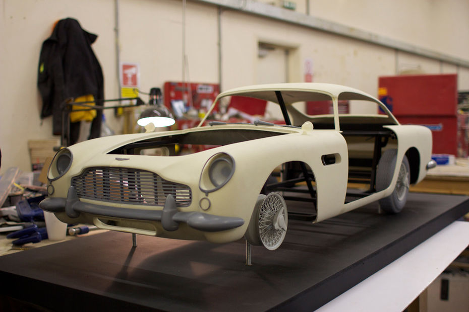 Уменьшенная модель Aston Martin DB5 (1963), напечатанная для того, чтобы быть расстрелянной в фильме «007: Координаты „Скайфолл“» (2012), в процессе сборки.