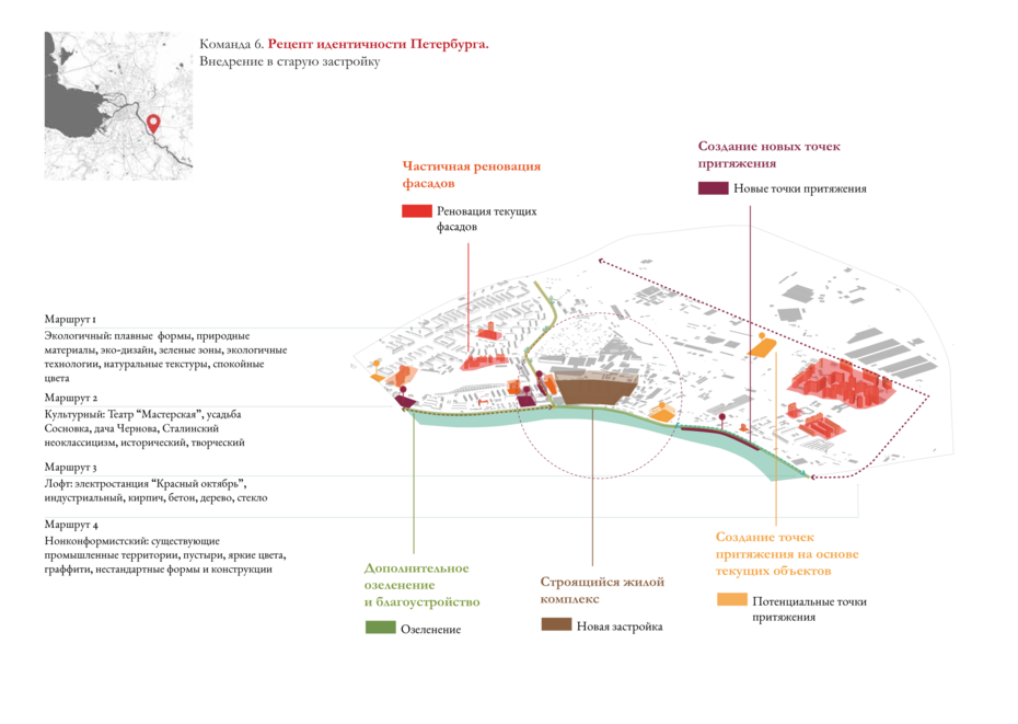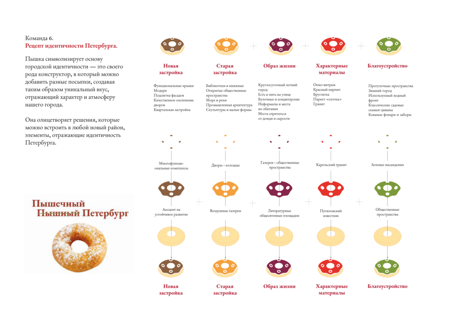 Проект курировал Фёдор Коньков, управляющий партнёр Института территориального планирования «Урбаника». В ходе работы над проектом авторы выработали комплексный подход к застройке и благоустройству территорий, а также создали своего рода городской конструктор, основанный на ключевых составляющих идентичности. Среди них были и петербургские пышки.