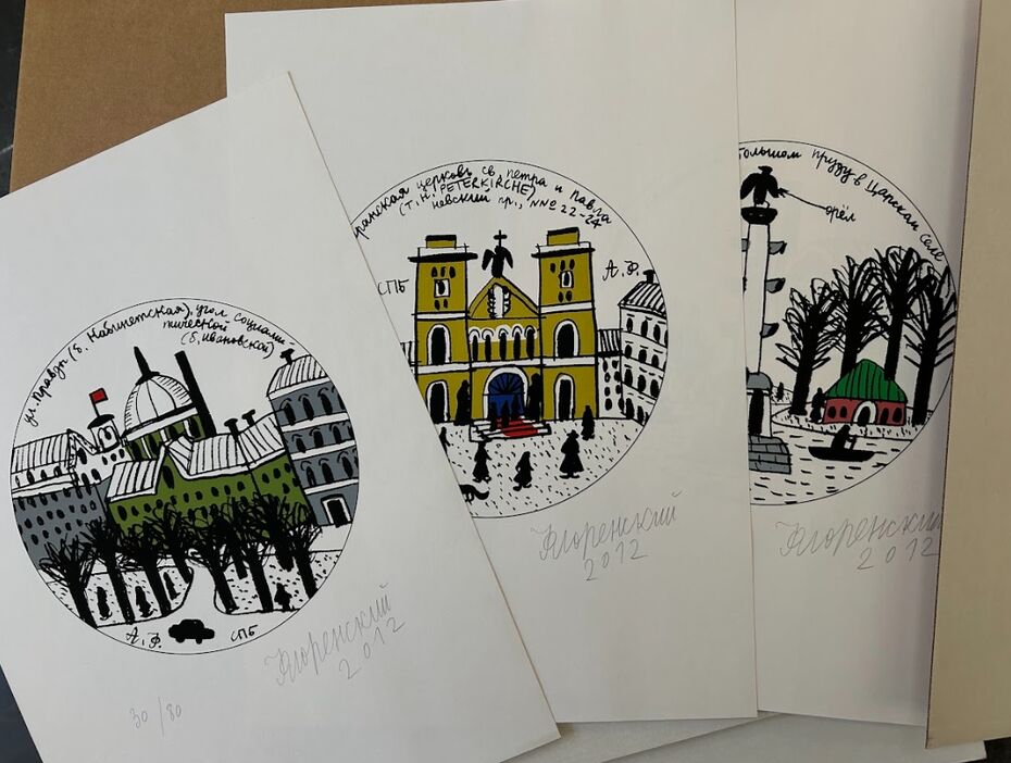Я покупал все выпуски работ студии ручной печати «Б&Ф». Это альбомы шелкографии круга художников, близких к «Митькам», которые издавал Саша Флоренский, с которым меня связывают очень давние дружеские отношения и личная любовь к его работам. Всего альбомов было выпущено более десятка. «Петербургская азбука» Саши Флоренского, вошедшая в один из выпусков, встречает всех прибывающих в аэропорт Пулково. Среди альбомов и работы Иры Васильевой — Иваси, и Владимира Яшке, и современных художников Грузии, в общем, достаточно большой объём печатной графики.
